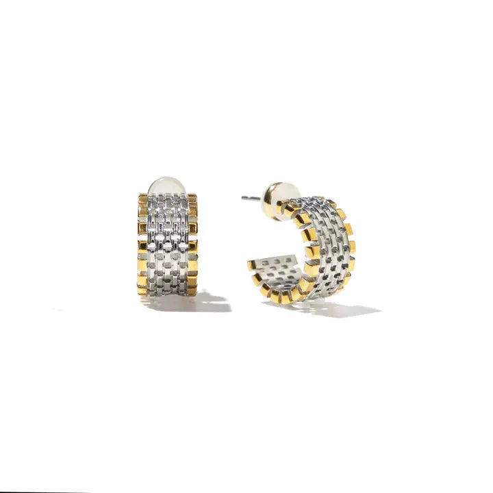 Structured like a watch, styled like a classic — these exclusive Brenda Grands hoops elevate your everyday. These exclusive Brenda Grands mini hoops are the perfect complement to our signature Transcend Bracelet. Designed with a bold, structured edge and a watchband-inspired silhouette, they combine modern elegance with effortless cool. Crafted in polished stainless steel and finished with 18k gold plating, they’re lightweight, waterproof, and made for everyday movement — from your 9 AM meeting to dinner at 9 PM.