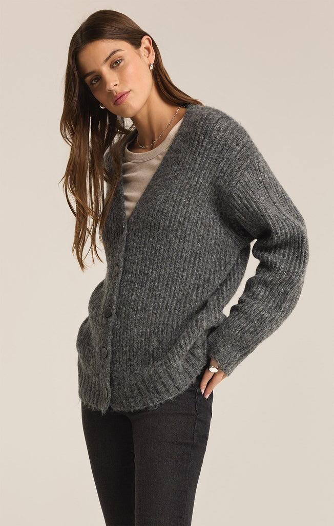 Experience ultimate coziness with this heathered, relaxed cardigan crafted from our soft and chunky sweater yarns. Featuring faux horn buttons for versatile styling and rib cuffs, it effortlessly elevates any outfit, whether worn open or closed.