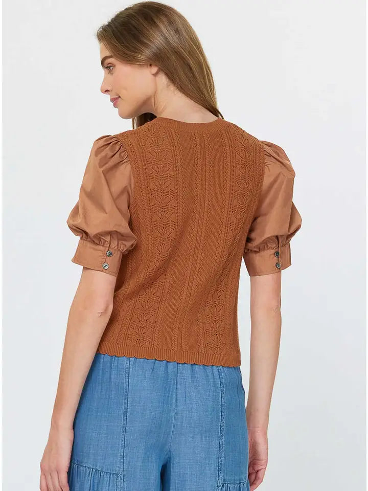 -Round neckline with button-down front -Soft knit body with delicate lace-like open stitching -Woven puff sleeves with buttoned cuffs -Ribbed hemline with subtle scallop finish -Hand wash in cold water A stylish sweater with soft texture and woven sleeves-easy to wear alone or layer with jackets and cardigans.